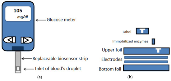 Blood glucose monitoring system: (a) Scheme of a commercial blood glucose test device, (b) different layers of a biosensor test strip. Reproduced from Reference [76].