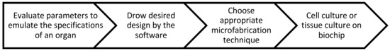 Figure 5 represents the general process to fabricate a microfluidic OOC platform. The principles to manufacture OOC based platforms are almost similar. Basically, after considering various parameters to emulate the specifications of a specific organ, the desired design would be drawn with a design and drafting software (e.g., AutoCAD, CATIA). Later, an appropriate microfabrication technique (e.g., photolithography, stereolithography, soft lithography etc.) according to the aims of the device will be used to fabricate the device. Cell culture or tissue culture will be performed on the biochip in order to mimic the functionality of a specific organ and to perform biochemical or biophysical assays and drug testing.