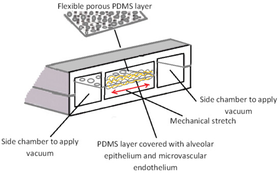Schematic design of the microengineered lung-on-chip model developed by Huh et al. [12]. An alveolar-capillary interface constructed on a flexible and porous PDMS membrane. By applying vacuum to the side chambers, a mechanical stretch has been created on the alveolar-capillary barrier to mimic a human breathing lung. Figure is reproduced from Reference [12].