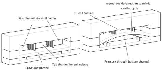 Schematic design of the heart-on-a-chip platform developed by Marsano et al. [92]. This includes two microchambers which are divided by a PDMS membrane. The top chamber is subdivided into a central channel to grow 3D cell culture, and two side channels to refill culture media. The cardiac muscle’s contraction and relaxation mimicked through deformation of PDMS membrane by applying pressure on the bottom channel. Figure is reproduced from Reference [92].