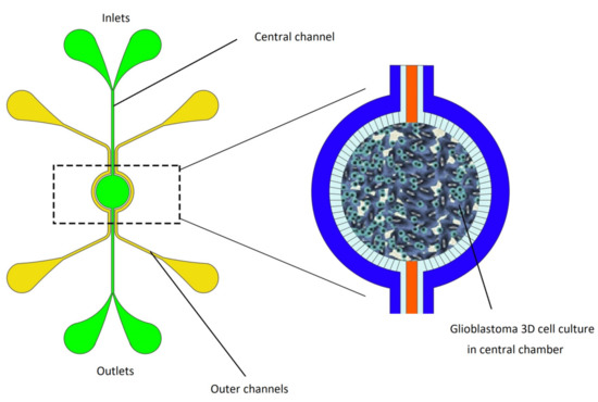 Magnetic hyperthermia therapy attracted researchers’ attention in cancer therapy due to the generation of local heat to minimize damage to healthy cells nearby and optimize the treatment. Recently, a microfluidic based brain tumor-on-a-chip model was developed by Mimani et al. [106] to access the therapeutic effect of magnetic hyperthermia on the chip. A 3D cell culture of glioblastoma has been cultivated in the central zone of the microfluidic channel. Cell viability after exposure to magnetic hyperthermia therapy has been studied on the device. Results of fluorescence imaging have demonstrated that cell viability decreased by 100% after 30 min of exposure to magnetic hyperthermia therapy. However, tumor vasculature is absent in this model; the results of this study showed that this brain tumor OOC model has great potential to emulate the characteristics of glioblastoma brain tumor in vitro (Figure 8).