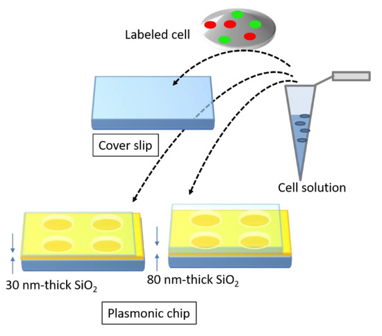 The magnitude of is determined by the pitch. Unlike the Bull’s eye-periodic structure having with only identical pitch, a hole-arrayed plasmonic chip with two types of is expected to result in brighter multi-color fluorescence imaging when using two kinds of fluorescent dyes with different emission wavelength ranges. The brightness in a fluorescence image is evaluated as the fluorescence enhancement factor which is obtained from the ratio of the fluorescence intensities in the plasmonic chip to that in the coverslip. In this study, as shown in Figure 2, at first, the appropriate thickness of a thin silica layer prepared on the top of silver film is studied for obtaining a larger enhancement factor. Silica layer make a role of distance suppressing a fluorescence quench and convenient environment for cell adsorption. The appropriate distance from the silver surface has been evaluated as 20–30 nm for protein detection [25,26], and the distance for the largest enhancement factor including a reflection interference effect has been evaluated as 40–50 nm [9]. Though the plasmonic chip can enhance the excitation electric field closer to the silver surface, the silver layer can also quench the fluorescence within the Förster distance, and the electric field due to the reflection interference shows the maximum at 80–100 nm from the surface. On the other hand, the appropriate distance has not been shown for fluorescence imaging of cells. Cell is too large compared with protein and only fluorescence from fluorescent dyes in the cell membrane adsorbed to chip surface can be enhanced. The appropriate thickness of a silica layer is examined for maximizing an enhancement factor in this study. Then, the enhancement factors in multi-color fluorescence images are evaluated and compared with those values found in our previous study on a Bull’s eye-type plasmonic chip. More than 10-fold values are expected for dual wavelength ranges.