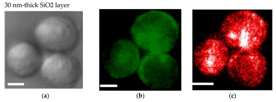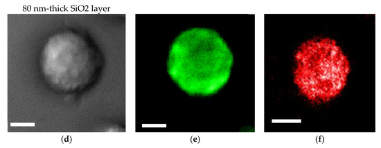 An SiO2 film formed on a plasmonic chip can suppress fluorescence quenching by its silver layer. An SiO2 layer is conventionally prepared at 20–30 nm on a plasmonic chip. In this study, the SiO2 layer was prepared at a thickness of 30 nm (Figure 4a–c) and 80 nm (Figure 4d–f), and the fluorescence intensities were compared between them in order to improve the sensitivity in multi-color imaging. The fluorescence intensity was evaluated to be 1.4 ± 0.5 -fold larger at 80 nm than at 30 nm. Fluorescence quenching by a metal’s surface is a function of the distance from the metal surface as predicted from the Chance–Prock–Silbey (CPS) model [9,30], and the reflection interference effect can increase as increasing SiO2 film thickness up to 80 nm. In the experimental results obtained in our previous studies [9], 40–50 nm was identified as the best distance for enhancement with consideration of the molecular size. In cell observation with a fluorescence microscope, only the fluorescence of a labeled antibody adsorbed into the chip’s surface can be enhanced. The results of the fluorescence intensity at 80 nm being 1.4-fold greater than that at 30 nm is not inconsistent with the above theory and experimental results. Therefore, in this study, a plasmonic chip with an 80-nm-thick SiO2 layer was prepared for the improvement of fluorescence images. As found from Figure 4e,f, EpCAM and EGFR distributions in a MDA-MB231 cell were clearly observed individually with our improved plasmonic chip.