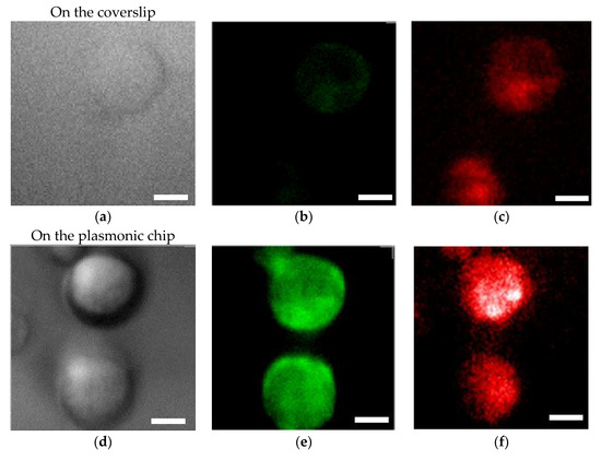 Bright field images (Figure 5a,d), fluorescence images of Alexa®488-EGFR (Figure 5b,e), and APC-EpCAM images (Figure 5c,f) taken on the plasmonic chip and the coverslip are shown in Figure 5. The fluorescence intensities F were individually evaluated at different five bright points selected from the center part of an identical cell for the Alexa®488 and APC images, and each background intensity and APC was also evaluated at five different points outside of the cell. The enhancement factor was calculated by using Equation (3):