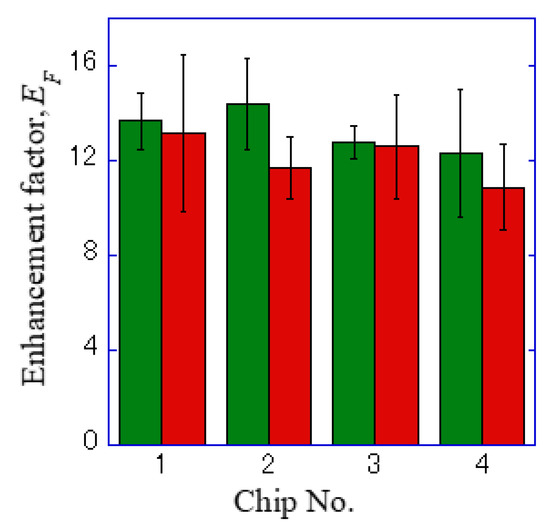 Enhancement factor for the four sheets of a plasmonic chip. The green and red bars correspond to the values for Alexa®488-EGFR and APC-EpCAM, respectively.