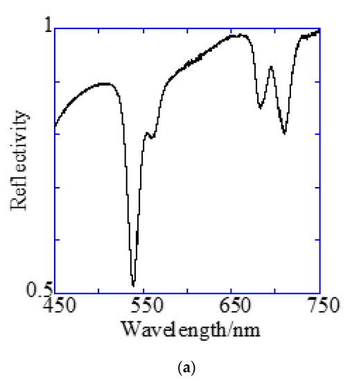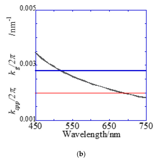 A Bull’s eye-type plasmonic chip has the unique with the same magnitude [24]. On the other hand, a hole-arrayed plasmonic chip has two kinds of , i.e., along the square side direction with m = 1 and along the diagonal direction with m = 2, which show the plasmon resonance at different wavelengths, individually. For and , the resonance wavelengths are theoretically calculated from the resonance condition described in Equations (1) and (2). Under vertical incidence, the spectra of , and were derived from Equation (1), as shown in Figure 7b. The intersections correspond to the resonance modes, i.e., and , and the resonance wavelengths under vertical incidence at were obtained at 695 nm and 520 nm for and , respectively.