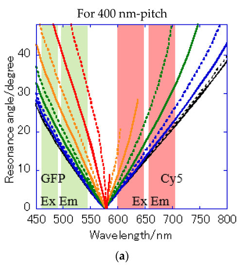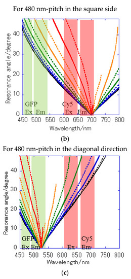 The resonance angle spectra of in the 400 nm pitch Bull’s eye-type chip are shown in Figure 8a. In the excitation wavelength range of the GFP filter, the incident angles available for plasmon coupling were limited to = 20–48° in a 400 nm pitch (Figure 8a), but they were improved by 10–48° for in the hole-arrayed plasmonic chip (Figure 8c). The excitation electric field intensity by the in a 500 nm pitch (Figure 8c) was larger than that by in a 400 nm pitch (Figure 8a) due to resonance angles at small angles. In addition, the incident light available for plasmon coupling was limited to φ = 0–70 in a 400 nm pitch (Figure 8a), but were improved by 0–90 for in a hole-arrayed chip (Figure 8c). On the other hand, in the excitation wavelength ranges of the Cy5 filter, the azimuth angles φ were limited to 0–60° in the Bull’s eye-type chip with a 400 nm pitch (Figure 8a), but in the hole-arrayed plasmonic chip, the effective azimuth angles were improved by 0–90° by (Figure 8b). In the emission wavelength of the Cy5 filter, a hole-arrayed chip (Figure 8b) can also use more effectively the azimuth angles compared to a 400 nm- pitch Bull’s eye-type chip (Figure 8a).