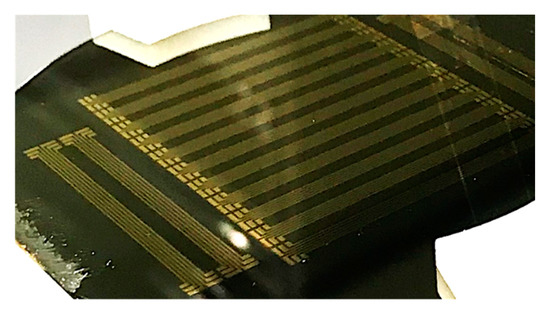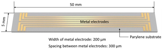 The prepared test samples underwent the scotch tape test to evaluate adhesion strength of the metal electrodes to the parylene substrate. The machine used for the scotch tape test was Shimadzu EZ-S machine (Shimadzu, Kyoto, Japan) dedicated for tensile testing. Figure 5 shows a photo of scotch tape attached on the test sample and schematics of the scotch tape test, respectively. The scotch tape is 3 M transparent tape 550. It has thickness of 50 μm and 12 mm width, and it provides adhesion to steel of 1.8 N/cm (or 0.18 N/mm).