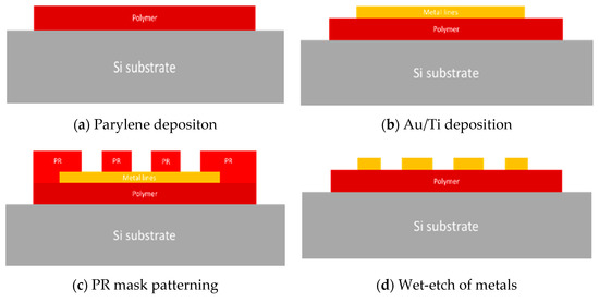 - Seok, S.; Park, H.D.; Choi, W.; Kim, O.; Kim, J. Analysis of Thin Film Parylene-Metal-Parylene Device Based on Mechanical Tensile Strength Measurement. In Proceedings of the DTIP 2019, Berlin, Germany, 8–12 September 2019. [Google Scholar]