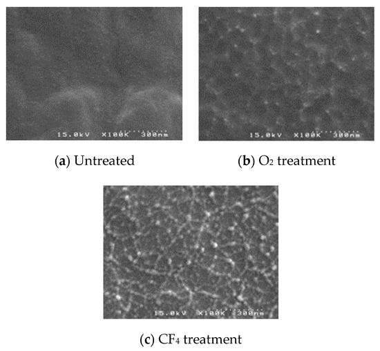 Figure 1 shows the schematic of test pattern; it has length of 50 mm and width of 5 mm. It consists of 6 metal lines; each metal line has 200 µm in width and is spaced at 300 µm as is the design of multi-channel neural probe. Test pattern fabrication process is shown in Figure 2; (a) A parylene (parylene-C) layer having 5 µm in thickness was deposited in a 4-inch Si wafer using by commercial parylene coater system (VPC-500, Paco Engineering, Incheon, Korea). The monomer was deposited on the surface of the silicon wafer at a vapor phase condition with 0.8 μm/min, and deposition temperature was 20 °C. (b) Before metal layers deposition, the parylene surface was etched with CF4 gas (process conditions; (25 mTorr, 20 sccm, 1.5 min)) without O2 in order to increase surface roughness reducing the hydrophobicity, as shown in Figure 3. Note that O2 was not used for surface modification since the parylene is susceptible to be surface oxidation causing degradation of mechanical properties of the polymer neural probe. Moreover, the nanopillar structures on parylene substrate was efficiently built with CF4 gas rather than O2 gas, as shown in Figure 3b,c. Besides, there have been two major methods to improve interfacial adhesion between parylene and metal layer: chemical treatment or mechanical surface modification with RIE (Reactive Ion Etching) etch (Plasma-therm 790 MF, Plasma-Therm, Saint Petersburg, FL, USA). Concerning the test sample used in our study, parylene was already deposited on a silicon substrate; thus, chemical treatment may have changed the properties of parylene substrate itself, as well as the interface on which the metal was deposited. Furthermore, RIE etch have shown better performance compared with conventional A-174 saline chemical treatment [15]. Therefore, we modified the parylene surface with CF4 plasma etch to make a nanopillared surface, increasing the interfacial energy. The effectiveness of the nanopillared parylene surface was confirmed during metal patterning step. Titanium (30 nm) and gold (300 nm) were sequentially deposited with using by E-beam evaporator (ei5, ULVAC, Methuen MA, USA) on the parylene substrate without rupture of vacuum. (c) Photoresist (AZ GXR 601 (46cp), Merck, Kenilworth, NJ, USA) was patterned as a metal etch mask. The process conditions are summarized in Table 1. (d) Gold was first etched with Au etchant (Gold ETCH TFA, Transene Company, Danvers, MA, USA) for 5 min, and then titanium is etched with BOE (Buffered Oxide Etchant) solution (Buffered oxide etch 6:1, VWR International, Radnor, PA, USA) for 10 s. After metal patterning, PR mask was removed with acetone. Etch time was 60 s.