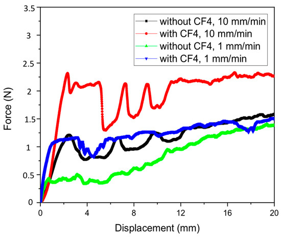 Metal adhesion to parylene substrate was then measured with the scotch tape test. Scotch tape was attached to the parylene surface, slightly away from the left-end metal line to the right-end of the metal. After that, two different strokes (10 mm/min and 1 mm/min) were applied to the scotch tape, and corresponding force was measured as shown in Figure 6. All metal lines were debonded from the parylene substrate for all the cases. It was found that the sample with CF4 treatment needs more force than that without CF4 treatment, which means a parylene surface with CF4 treatment sticks better to scotch tape. This is a proof that parylene surface energy can be increased with only CF4 treatment without O2.
