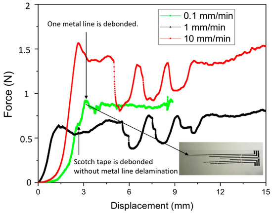 The first peak in each measured force was due to initiation of metal debonding, which makes abrupt drop of force. Minimal adhesion force is found when a stroke of 1 mm/min was applied to the parylene test sample without CF4 treatment (green line). It can be said that the metal adhesion had lower than the adhesion value estimated from the first peak. The adhesion can be calculated as follows; (0.5 N/12 mm) × (1.2 mm/12 mm) = 4.2 N/m. As all metal lines were debonded, the metal adhesion should have had lower than 4.2 J/m2. Thus, a lower stoke of 0.1 mm/min was applied to find metal adhesion to the parylene substrate. In this case, the scotch tape was attached only to the narrow metal lines of CF4 treated parylene and then force was recoded while stroke of 0.1 mm/min is applied. The measured force-displacement curve was compared with the previous results of 1 mm/min and 10 mm/min, as shown in Figure 7. As remarked in Figure 7, the scotch tape was debonded up to 0.9 N without metal line delamination, and one metal line started to debond from 0.91 N. Therefore, metal adhesion could be extracted from this peak force; (0.91 N/12 mm) × (0.2 mm/12 mm) = (76 N/m) × (0.017) = 1.29 N/m = 1.29 J/m2. Note that inset shows transferred metal lines on the scotch tape. Scotch tape strokes of 1 mm/min and 10 mm/min introduced large force fluctuation, which would result from relatively large applied force compared with interfacial energy.