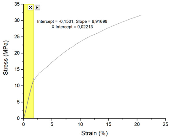 For FEM modeling, material properties of each element are important to get good simulation results. Required material properties in this modeling are Young’s moduli and poisson ratios of scotch tape and parylene and strain energy release rate of interface between the scotch tape and parylene. Young’s modulus of the scotch tape is extracted from tensile test result, as shown in Figure 8. The Young’s modulus of the scotch tape is 6.9 MPa in the elastic region, and the maximum applied force in the elastic region is 7.6 N when the applied strain is 2.2% (2.2 mm elongation as test scotch tape length is 100 mm). From the tensile test result, scotch tape in the metal adhesion test would be in the elastic region as the applied force is less than 2 N in all the cases. Poisson ratio of the scotch tape is assumed to be 0.4 as other polymer materials. Young’s modulus and poisson ratio of parylene are 2.67 GPa, as extracted in previous work, and 0.4, respectively [23]. Table 3 summarizes material properties for the FEM model. Note that interface material properties were defined with critical strain energy release rate. The value for critical strain energy release rate was the measured adhesion force as explained earlier.