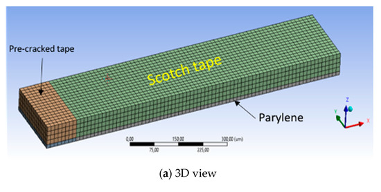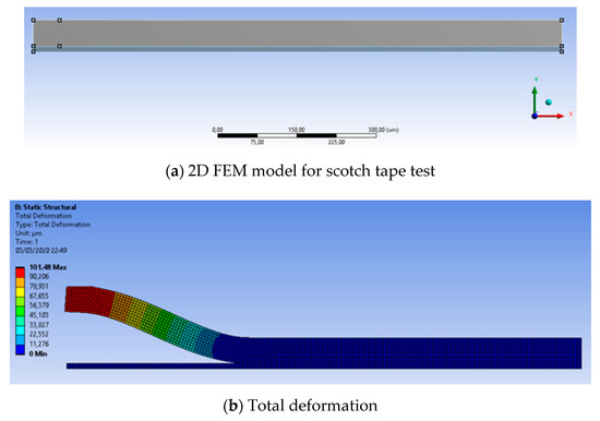 A 2D FEM model for crack propagation was built, as shown in Figure 9a. The length of this model was 1000 µm, and thickness was 50 µm for scotch tape and 5 µm for parylene polymer. The following boundary conditions were applied: bottom line is fixed and displacement load is applied to left-top end, having 50 µm width. Note that 2D model behavior was defined as plane strain. Total deformation of the model when displacement of 100 μm in y direction was applied to the scotch tape is presented in Figure 9b. As is in the scotch tape test, delamination of the interface between scotch tape and parylene occurred, and crack propagated in x-direction.