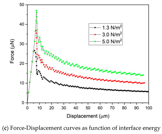 Force-displacement was investigated as function of interface adhesion energy, as shown in Figure 9c. The required force for crack initiation was increased as interface adhesion energy increased, as expected. The force magnitude smaller than the measurement would have been due to thickness effect in 2D simulation. An important parameter in this graph is minimal displacements for crack initiation: 5 µm, 6.7 μm, and 7.6 μm for 1.3 N/m2, 3.0 N/m2, and 5.0 N/m2, respectively. These parameters are included in the following 3D interface delamination as a part of CZM parameters. From the simulation results, strain energy release rate (SERR) for mode 1 referring to VCCT (Virtual Crack Closure Technique) (G1), SERR for mode 2 from VCCT (G2), and SERR for mode 3 from VCCT (G3) were found 0.5 J/m2, 0.75 J/m2 and 0 J/m2, respectively. The total amount of VCCTs corresponded to the interface energy of 1.3 N/m2. Principal modes of the fracture of the delamination was from mode 1 and mode 2.