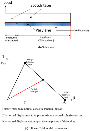 Figure 10a shows 3D model for the CZM interface delamination. As indicated in Figure 10b, there were two different regions in this model: pre-cracked (interface I) and CZM-modeled (interface II). CZM is a useful way to simulate interface delamination, which is frequently used for thin film delamination and transfer packaging technique [24,25]. The interface II, which is of interest for the adhesion, is modeled with CZM (Cohesive Zone Model) parameters, as explained in Figure 10c. As the bilinear CZM model needs at least two parameters, maximum normal traction and normal displacement at debonding was defined, as presented in Table 4. The minimal gaps for the fracture initiation found from the previous crack propagation simulation were included for 3D CZM simulation to estimate applied force to initiate the interface crack.