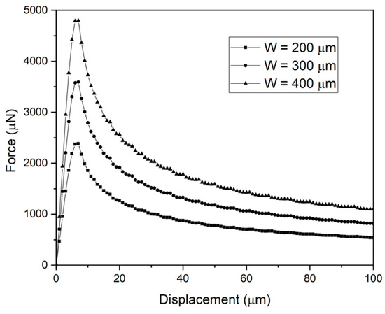 A displacement load was applied to one-end of the scotch tape, and then the force-displacement was extracted from the simulation. Referring to bilinear CZM model, critical strain energy release rate was calculated 1.25 J/m2. Initial width of the 3D model was 200 µm as was the fabricated metal electrode width. As in the 2D case, displacement load was applied to left-tip end. Extracted force-displacement curve at the loading place is presented in Figure 11. Minimal force for debonding of scotch tape was estimated 1.2 N/m, while measured one was 1.29 N/m. Adhesion force of the simulation had a good agreement with the measurement. Width of metal electrode could have been increased to get larger interface adhesion, as shown in Figure 11 When wider metal electrode is used to achieve larger metal-parylene adhesion, metal line impedance for neural signal acquisition should be taken into account.