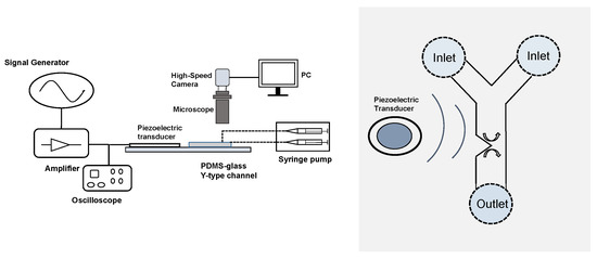 Left—Sketch of the experimental setup. A piezoelectric transducer is glued on a glass microscope slide, which is used as a coverslip for a PDMS microchannel with one or several sharp-edge structures. The transducer is supplied with a function generator and a home-made amplifier, adjusted by the peak-to-peak voltage monitored with an oscilloscope. The fluid seeded with fluorescent particles is brought by a syringe pump through two inlets. The flow inside the microchannel is visualised by a high-speed camera connected to a binocular microscope. Right —The piezo-transducer generates an acoustic wave within the Y-shaped channel. In the vicinity of the sharp-edge structure, the acoustic wave generates a streaming flow.