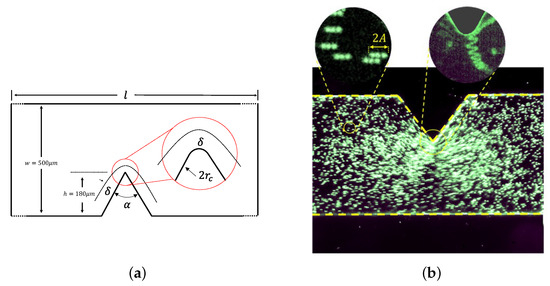 The experimental setup is sketched in Figure 1, and presented in more detail in [35]. It is built around a Y-shaped polydimethylsiloxane (PDMS) microchannel devised by standard photolithography techniques: starting from a SU8 resist-made mould of thickness 50 m made on a silicon wafer, a mixture of PDMS (Sylgard 184) with 10% in mass of curing agent is poured on the SU8 mould and forms a 2.5-mm-thick layer on top of the wafer. After a baking at 65 C for 4 h, the PDMS mixture is then sealed and attached to a glass coverslip after a 1 mn O plasma treatment of both faces. A PDMS microchannel of depth p = 50 m is then obtained. The width w is equal to 500 m. Its geometrical dimensions are detailed in Figure 2a. Sharp edges with different angles (30, 60, 80 and 90) could be fabricated from various moulds, and previous studies evidenced that a sharper tip and more acute angle would lead to stronger streaming under the same forcing amplitude [30,31,32,35,36]. For the present study, since the focus is on the influence of and f, we operated with the same angle of = 60, with a corresponding tip diameter of = 5.8 ± 0.4 m.