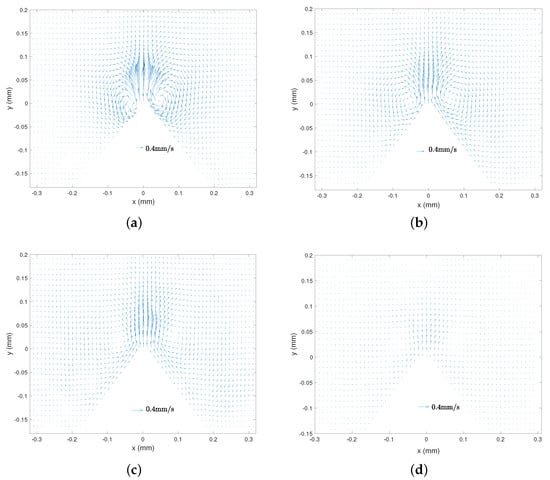 Figure 3a–d present typical streaming velocity fields obtained from the PIV treatment. The streaming flow appears as a main central jet from the tip, which is symmetric with respect to the y axis (x = 0). It clearly appears that the flow intensity decreases with an increasing viscosity. The jet induces the formation of two symmetric vortices beside the sharp edge. In terms of location, the eddies are very near to the tip for the lowest viscosity, and for more viscous liquids they are pushed away and more aside from the tip. Let us also remark that at higher viscosity (Figure 3c,d), the flow in the VBL along the lateral walls becomes relatively thicker.