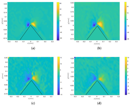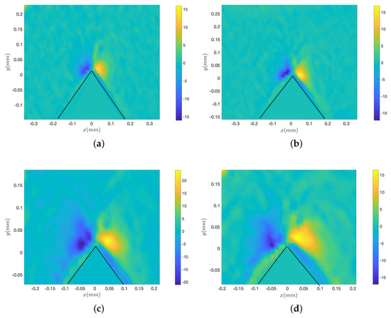 Vorticity maps of the streaming fields corresponding to the cases of Figure 7a–d. = 4.32 mm/s (Fluid 3) and = 22.4 mm/s. (a) f = 3500 Hz, (b) f = 2500 Hz, (c) f = 1250 Hz, (d) f = 800 Hz. Dotted lines show the boundaries of the sharp edge.