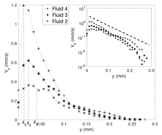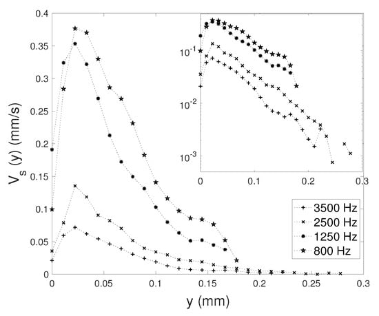 We extract the velocity profile for the four values of frequency, under the same conditions as those of Figure 7 and Figure 8; in particular, is fixed at 22 mm/s. Results are plotted in Figure 9. The y locations of the maxima roughly correspond to the VBL thickness at respective f: 19.8 m, 23.4 m, = 33.2 m and 41.5 m. The maximal velocity itself is very much dependent on f, but the typical length-scale of the decay along y is comparable for all four experiments, as revealed by the Lin-log plot in the insert. The four velocity profiles are shifted from each other with a given offset.