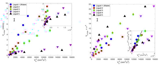 To verify this theory, Figure 6 show the results of the experimental maximal streaming velocity versus the square of the acoustic forcing velocity amplitude , presented either as raw data (Left) or via the quantity , with a is an exponent deduced from Ovchinnikov et al.’s theory [37], equal to −0.9 for an angle = 60 as stated above. In the inset, the quantity plotted versus shows a partial collapse of data in the range of the smallest values of , roughly below 800 mm/s. At this stage of our investigations, we are unable to explain such a trend. From these results, we can simply conclude that viscosity strongly influences the streaming flow generated around sharp edges. But the dependence cannot be simply captured by the predictions of the perturbative theory from Ovchinnikov et al. [37], nor by any arbitrary power-law. In any case, the results show the quantitative confirmation that the independence on observed in classical Rayleigh–Schlichting streaming is lost in sharp-edge streaming.