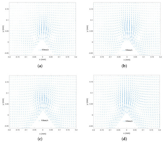 Streaming velocity field from PIV measurements, with different excitation frequencies = 4.32 mm/s (Fluid 3) and = 22.4 mm/s. (a) f = 3500 Hz, (b) f = 2500 Hz, (c) f = 1250 Hz, (d) f = 800 Hz. Scales are the same for the four cases.
