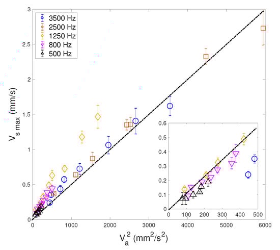 Figure 10 shows the maximal velocity versus the square of the acoustic forcing velocity , for different values of frequencies f and the same liquid viscosity = 4.32 mm/s. Each data group obtained at constant f shows a linear trend: . However, the dependence of the prefactor on f is unclear. Obviously, the theoretical prediction of [37] shown in Equation (2) fails to predict this strong dependence on f. However, it is possible to make two groups of data: