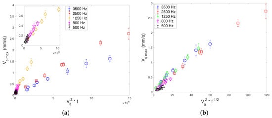 To further test the possibility of a scaling law that would capture the dependence of the streaming velocity on f, we attempted to plot versus potential pertinent combinations of powers of and f. In classical Rayleigh–Schlichting streaming, usually depends linearly on [42,45]. But it turns out that plotting versus leads to even more scattered data points.