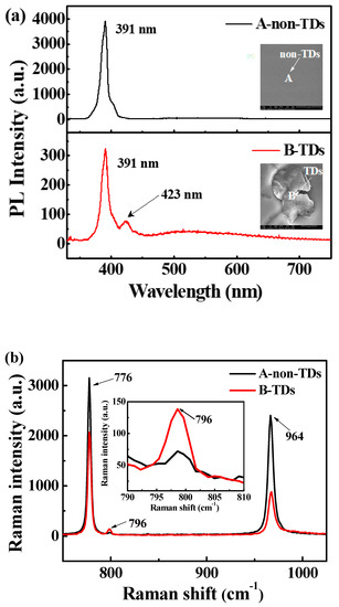 (a) Room temperature micro-photoluminescence (PL) spectra. The insets show scanning electron microscopy (SEM) images of region A (non-triangular defects (TDs)) and region B (TDs); (b) Micro-Raman spectra corresponding to the A and B positions in the 4H-SiC epilayer grown with C/Si = 1.1. The inset is a comparison of the intensity of the Raman peak at 796 cm−1 in the enlarged view.