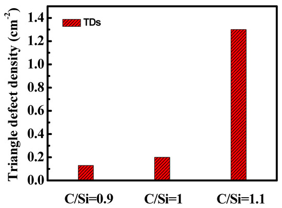 Figure 1a shows the room temperature micro-PL spectra corresponding to the A and B positions in the illustration for the 4H-SiC epilayer grown with C/Si = 1.1. The inset SEM image at position A exhibits the crystal structure region of the 4H-SiC epilayer without TDs. The strongest peak of 391 nm corresponding to 3.17 eV is attributed to the typical band edge emission of 4H-SiC [33]. However, at the apex of the TDs (position B), the 4H-SiC band edge emission intensity at 391 nm was significantly reduced. Furthermore, an additional small emission peak appeared at 423 nm corresponding to 2.93 eV, which is consistent with the emission wavelength of the stacking fault in the 4H-SiC epilayer. This stacking fault is determined by the different stacking order, which is defined as a single Shockley SF (1SSF) using the Zhdanov notation [34,35]. Figure 1b shows typical micro-Raman spectra of 4H-SiC at points A and B. The results show two FTO modes at 776 cm−1 and 796 cm−1, and an FLO mode at 964 cm−1, which is consistent with the typical Raman spectra of 4H-SiC [36]. However, for the TD region (point B), the intensity of the Raman peak at 796 cm−1 is gradually increased. Since the 3C-SiC also has a TO peak at 796 cm−1, the presence of the 3C-SiC polytype could be inferred. The ratio of the two peaks can be taken as a measure of the presence of the 3C-SiC polytype [37]. Therefore, we can confirm that stacking faults and the 3C-SiC are the reasons of nucleation at the triangle defect vertex. Figure 2 shows the dependence of TD density on the C/Si ratios for 4H-SiC epilayers. The wafers (#1~#3) were inspected using optical microscopy to evaluate the density of TDs. The results show that the density of TDs is reduced from 1.3 cm−2 to 0.13 cm−2 with the C/Si ratio decreasing from 1.1 to 0.9. Kojima et al. have reported that the origin of the TDs is attributed to step-bunching caused by the interrupted step-flow growth [38]. In the carbon-rich growth environment (C/Si = 1.1), the surface free energy of the crystal surface is higher than that under silicon-rich conditions, so it is necessary to reduce the surface free energy by the formation of step-bunching [39]. Thus, there is a higher probability of two-dimensional nucleation due to the suppression of the step-flow growth at high C/Si ratios. Consequently, a relatively low C/Si ratio can effectively reduce the TD density.