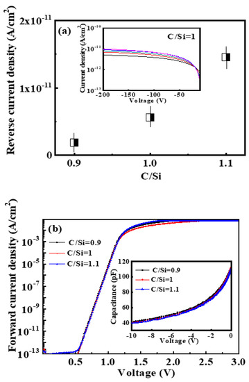 It is well known that TDs are fatal to power devices, directly causing device failure. Moreover, although the TDs could be got rid of in most areas of the epitaxial wafer by a proper C/Si ratio, there still exist some hidden defects that affect device performance, such as interface states and deep defects, etc. Therefore, we selected the devices without TDs on the epilayer region to further investigate the effect of hidden defects on the performance of 4H-SiC SBDs prepared on epilayers with different C/Si ratios (C/Si = 0.9, 1 or 1.1). Figure 3a shows the mean values of the reverse current density varying with the C/Si ratios under the reverse bias voltage of −200 V. It is noted that there is still a minor difference in device performance due to process unevenness even in the same wafer. In order to eliminate the influence of the performance non-uniformity between devices, we analyzed the average reverse I-V results of five samples randomly selected on each wafer, and Ni/4H-SiC SBDs with C/Si = 1 is shown as an example in the inset of Figure 3a. It is found that the average values of the reverse current density of Ni/4H-SiC SBDs with C/Si = 0.9, 1 or 1.1 are 1.8 × 10−12 A/cm2, 5.6 × 10−12 A/cm2, and 1.5 × 10−11 A/cm2, respectively. With the increasing of C/Si ratios, the reverse leakage current gradually increases. Compared with the sample with C/Si = 0.9, the leakage current of the sample with C/Si = 1.1 increases by nearly an order of magnitude. Figure 3b shows the forward I-V characteristics of Ni/4H-SiC SBDs under different C/Si ratios. It is seen that all samples have relatively uniform and consistent forward I-V curves. According to the thermionic emission (TE) theory, the relationship between current and voltage is defined by [40]