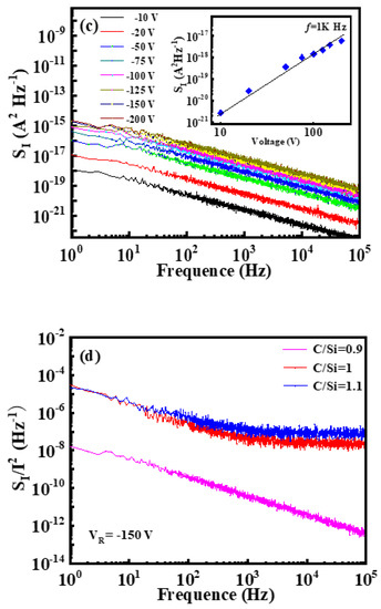 Figure 3c show the frequency and bias voltages dependence of the spectral noise density (SI) for the Ni/4H-SiC SBDs with C/Si=0.9 at room temperature under various reverse bias voltages (VR = −10~(−200) V). It is clearly observed that the spectral noise density is inversely proportional to the frequency at different voltages and increases approximately linearly with the increase of the reverse bias voltage. It has the form of 1/fα noise, where α=1, its characteristics is flicker noise (1/f noise). This dependence is consistent with the reported results of SiC Schottky diodes (α = 0.5~1.5) [44,45]. The main contribution to 1/f noise and resistance noise comes from the Schottky barrier. Figure 3d shows the noise spectra of the Ni/4H-SiC SBDs with varying C/Si ratios (C/Si = 0.9, 1 or 1.1) under VR = −150 V. It displays 1/f behavior at frequencies below 1K Hz for all samples. Furthermore, the spectral noise density increases with the increase of the C/Si ratio, and the minimum is obtained at C/Si = 0.9. However, for the samples with C/Si = 1 and 1.1, the noise spectra become almost frequency independent at frequencies greater than 1K Hz. Several orders of magnitude increase in the noise are caused by superimposed thermal noise (SI = 4K0Tg) due to larger reverse current in samples with C/Si = 1 or 1.1, which is in agreement with the results of Figure 3a. The 1/f noise is mainly affected by the factors such as the interface state and crystal quality of the semiconductor material. Zhang et al. reported that the 1/f noise is reduced significantly with the increase of temperature in the SiC MOSFET within a temperature range of 85~510 K, which is attributed to the interface trap density decreasing with the temperature [46]. Soibel et al. also revealed that the 1/f noise in the InAs/GaSb superlattice detector is related to the side leakage current caused by the surface states. The larger side leakage current is induced by the higher surface state density, leading to a significant increase in noise [47]. Accordingly, our results show that as the C/Si ratio decreases, the spectral noise density decreases by about three orders of magnitude (C/Si = 0.9). The influence of C/Si ratios on device noise should be due to the surface state density or the interface state density caused by different crystal quality of 4H-SiC epilayers. Therefore, an optimized C/Si ratio not only effectively improves the performance of SBDs, but should also improves the responsivity of the Schottky barrier UV photodetector due to the reduction of noise.