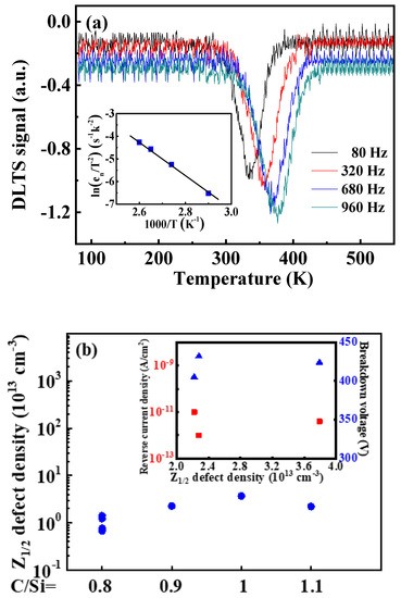 (a) Deep level transient spectrum testing (DLTS) spectra of Ni/4H-SiC SBD with C/Si = 0.9; (b) The Z1/2 defect concentration of Ni/4H-SiC SBDs under different CVD growth conditions. The inset shows the dependence of the reverse current density under VR = −200 V (red square symbols) and breakdown voltage (blue triangle symbols) on Z1/2 defect concentration for Ni/4H-SiC SBDs with C/Si ratios (C/Si = 0.9, 1 or 1.1).