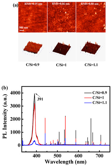 (a) Atomic force microscopy (AFM) images and (b) PL spectra of 4H-SiC epilayers with C/Si ratios (C/Si = 0.9, 1 or 1.1).
