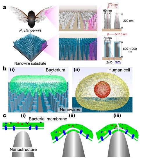 (a) Schematic illustrations of nanostructures on the wing of P. claripennis (upper) and antibacterial nanowire substrate (lower). Although arraigned nanowire structures are simply illustrated here, fabricated nanowires were randomly orientated. (b) Schematic illustrations of (i) a bacterium and (ii) human cell on nanowire structures. While the human cell attached on the nanowire structures was alive, the bacterium on the structures was mechanically ruptured and inactivated. (c) Schematic illustrations of the bacterium rupture mechanism. (i) A cell membrane of the bacterium was attached on the nanostructure. (ii) The membrane was stretched via the nanostructure and the surface area of the membrane increased. (iii) The membrane was ruptured due to too much stretching.