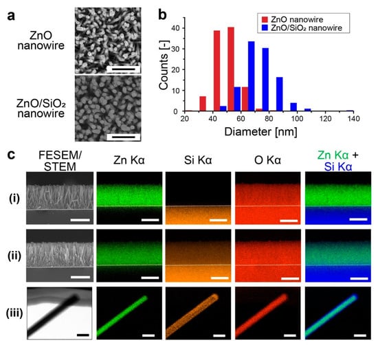 (a) Scanning electron microscope (SEM) images of ZnO nanowire (upper) and ZnO/SiO2 nanowire (lower) as a top view (scale bars, 500 nm). (b) Nanowire diameter of ZnO nanowires (red) and ZnO/SiO2 nanowires (blue). (c) Elemental mapping images by field-emission scanning electron microscope (FESEM) or scanning transmission electron microscope (STEM); Zn Kα, Si Kα, O Kα, and merged. Merged images were constructed from Zn Kα (green) and Si Kα (blue). Mapping images are for: (i) free-standing ZnO nanowires (scale bars, 1 µm), (ii) free-standing ZnO/SiO2 nanowires (scale bars, 1 µm) and (iii) single ZnO/SiO2 nanowire (scale bars, 100 nm).