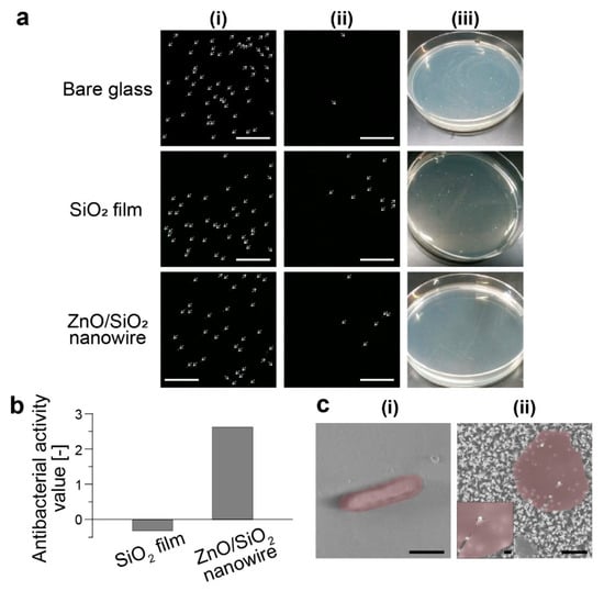 Bare glass substrate (Matsunami Glass Industry, Ltd., Osaka, Japan), 50 × 50 mm in size for culturing bacteria, and fused silica substrate (Crystal Base Co., Ltd., Osaka, Japan), 12 mm in diameter for culturing human cells, were immersed into piranha solution, which was a mixture of hydrogen peroxide and sulfuric acid in a volume ratio of 1:4. The substrate was placed on a petri dish, the piranha solution was poured and the solution was heated at 180 °C on a hotplate for 2 h. After cooling, the substrate was taken away from the dish by using a Teflon tweezer, washed by Milli-Q water and heated at 300 °C to dry it by using an electric furnace (FB1314M, Thermolyne). The seed layer for ZnO nanowires was prepared by the following procedures (Figure S1(ai,ii)) [30,31]. As seed solution, 75 mM zinc acetate dihydrate (Sigma-Aldrich Co., Ltd., Saint Louis, MO, USA) and 75 mM ethanolamine (Sigma-Aldrich Co., Ltd.) were dissolved into 2-methoxyethanol (Wako Pure Chemical Industries, Ltd., Osaka, Japan) at 65 °C. A total of 1000 or 100 µL of the seed solution was dropped on the bare glass substrate or fused silica substrate, respectively. Each substrate was spin-coated at 3000 rpm for 30 s, and then heated at 300 °C for 3 min. The above procedures were repeated six times to form the ZnO seed layer. Next, ZnO nanowires were hydrothermally synthesized (Figure S1(aiii,iv)). Each substrate with the ZnO seed layer was immersed into the nanowire growth solution, which was a mixture of 20 mM hexamethylenetetramine (Wako Pure Chemical Industry, Ltd.) and 20 mM zinc nitrate hexahydrate (Alfa Aesar) in Milli-Q water and heated at 95 °C for 5 h inside an oven (DKM400, YAMATO Scientific Co., Ltd., Tokyo, Japan). After washing with Milli-Q water, each substrate was dried by flowing nitrogen. A SiO2 layer (10 nm thick) was deposited on the ZnO nanowires using an atomic layer deposition apparatus (Savanna G2, Ultratech/Cambridge Nanotech Inc., Waltham, MA, USA). Tris(dimethylamino)silane (TDMAS; Japan Advanced Chemicals, Kanagawa, Japan) and ozone were used for SiO2 deposition at 150 °C with 100 cycles.