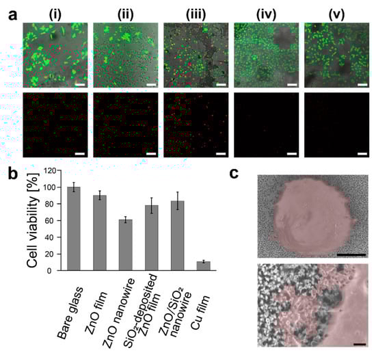 ZnO film, copper (Cu) film, which is generally known to have high cytotoxicity [32,33], and SiO2-deposited ZnO film were prepared on each substrate without nanowire structures. The ZnO film was fabricated by spin-coating where seed solution and a heating procedure were the same as in the ZnO nanowire fabrication described above. The SiO2-deposited ZnO film was prepared by SiO2 growth on the ZnO film by atomic layer deposition at 150 °C with 100 cycles. The Cu film (100 nm thick) was sputtered using a direct current sputtering apparatus (SC-701Mk Advance, Sanyu Electron Co., Ltd., Tokyo, Japan).
