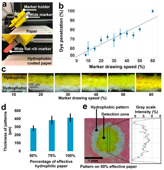 To measure the effects of the wide marker coating on reducing the thickness of the chromatography paper, the marker was plotted for various speeds (Figure 2b,c). We measured the dye penetration thickness at 10 points for each marker speed. A higher dye penetration signaled a larger effective thickness of the chromatography paper. As the drawing speed was increased, the effectiveness of the hydrophobic solution on reducing the thickness of the paper decreased linearly (Figure 2b,c).