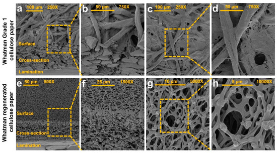 Physical characterization of Whatman grade 1 and regenerated cellulose paper. (a) SEM image with 250× magnification and (b) 750× magnification of the laminated Whatman grade 1 cellulose paper, showing the 45° view of surface and cross-section. (c) SEM image with 250× magnification and (d) 750× magnification of the Whatman grade 1 cellulose paper surface. (e) SEM image with 500× magnification and (f) 1500× magnification of the laminated Whatman regenerated cellulose paper, showing the 45° view of surface and cross-section. (g) SEM image with 5000× magnification and (h) 10,000× magnification of the Whatman regenerated cellulose paper surface.