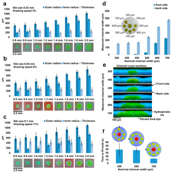Characterization of high-resolution fabrication of detection zones and channels. (a) The resolution of 0.03 mm fiber technical pen on regenerated paper with optimal 3% drawing speed (N = 9 and the error bar shows the standard deviation); (b) the resolution of 0.05 mm fiber technical pen on regenerated paper with optimal 6% drawing speed (N = 9 and the error bar shows the standard deviation); (c) the resolution of 0.1 mm fiber technical pen on regenerated paper with optimal 11% drawing speed (N = 9 and the error bar shows the standard deviation). The results measured using MATLAB script at 8 angles around each reaction area across reaction areas. (d) The graph of the measured microfluidic flow channel width versus the plotted channel width (N = 8 and the error bar shows the standard deviation). The channels are plotted using the 0.1 fiber technical pen with 11% drawing speed and the channel widths are measured in ten equidistant locations using ImageJ software across three test repeats. (e) The cross-sectional image taken of each channel. The channels are filled with yellow food dye to clarify channel vs. barrier. (f) The average time to fill bulb for each corresponding equal channel test (N = 8 and the error bar shows the standard deviation). The color-altered images above the chart display the flow state as the first bulb was completely filled (star marks first bulb to fill).
