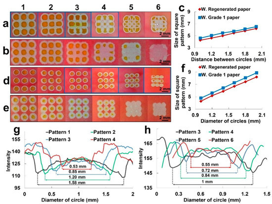 Packing density analysis of closely patterned detection zones. (a,b) High-resolution packing of detection zones on Whatman regenerated paper (a) and Whatman grade 1 paper (b). The diameter of circles in each pattern is 2 mm. The center-to-center distance between adjacent circles starts at 2 mm in the first pattern and decreases by 0.2 mm in each pattern. (c) Graph of pattern size versus center-to-center distance between adjacent circles in subfigure a and b (N = 9 and the error bar shows the standard deviation). (d,e) High-resolution fabrication of detection zones on Whatman regenerated paper (d) and Whatman grade 1 paper (e). The diameter of circles and center-to-center distance in the first pattern is 2 mm and 3 mm, respectively. The diameter of circles and the center-to-center distance between adjacent circles decrease by 0.2 mm and 0.3 mm in each pattern, respectively (the diameter of circles and the center-to-center distance of pattern 6 are 1 mm and 1.5 mm, respectively). (f) Graph of pattern size versus diameter of circles of subfigures d and e (N = 9 and the error bar shows the standard deviation). (g) Graph of grayscale intensity analysis of food dye in detection zone of pattern 1–4 of subfigure a. (h) Graph of grayscale intensity analysis of food dye in detection zone of pattern 3–6 of subfigure d.