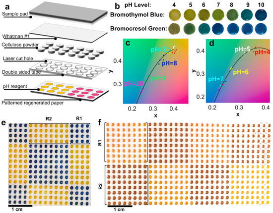 To show the applicability of the presented method, we plotted a matrix of circles with diameter of 1.6 mm. After patterning the laminated regenerated paper, the pH indicators were spotted in the detection zones using the technical pen and dried in room temperature. The indicators used were bromothymol blue (0.8 mg/mL), bromocresol green (0.8 mg/mL), and methyl red (2.5 mg/mL). To be able to deliver a sample simultaneously to multiple detection zones, we designed a multilayer paper-based device consisting of a laminated Whatman regenerated paper, a layer of double-sided tape, cellulose powder, Whatman grade 1 paper, and Fusion 5 sample pad (Figure 6a). The double-sided tape was cut by a CO2 laser cutter and attached to the laminated regenerated paper which were patterned. To make sure that the sample wicked reproducibly between the layers of the device, the holes of the double-sided tape were filled with cellulose powder, the excess powder was wiped out, and, after peeling the plastic backing of the tape, the cellulose remained in the holes. Then, the Whatman grade 1 paper and sample pad were stacked on the top. To show the ability of the device to quantitatively measure pH levels from 4 to 10, we used two indicators (0.8 mg/mL of bromothymol blue and bromocresol green) (Figure 6b) and obtained calibration curves (Figure 6c,d). To demonstrate the functionality of the proposed method for high-resolution and high-throughput fabrication of multiplex assay paper-based devices, we fabricated devices with 256 and 512 detection zones and tested them with pH 10 and pH 4 samples, respectively (Figure 6e,f).