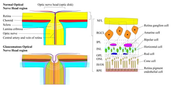 Physiological and pathologic structure of optic nerve head region. NFL: nerve fiber layer, RGCL: retina ganglion cell layer, IPL: inner plexiform layer, INL: inner nuclear layer, OPL: outer plexiform layer, ONL: outer nuclear layer, IS/OS: inner segment/outer segment, RPE: retina pigmented epithelium.