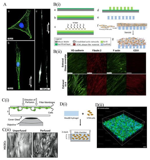 Beyond ridge-and-groove patterning, the surface topography of 2D-culture platforms can also be varied through the use porous membranes. As early as 1988, TM cell monolayers were cultured on porous filters as a means of quantifying the tissue’s hydraulic conductivity [118]. More recently, Professor Yubing Xie’s group used lithography techniques to develop a highly porous, gelatin-coated membrane of SU-8, a biocompatible and photo-definable epoxy [114,119,120,121] ((i) of Figure 4B). Similar to previous platforms, culture of TM cells on this membrane recapitulated the elongate in vivo morphology of this cell type. Compared with polyester Transwell inserts—a commercially available membrane with lower porosity and a less regular porous structure—the SU-8 membrane promotes higher cell coverage and more elongate cell morphologies. Moreover, use of the SU-8 culture surface upregulated not only myocilin, but also αB-crystallin, α-SMA, collagen IV and fibronectin in cultured TM cells. Taken together, these findings emphasize the significance of porosity and membrane pore pattern in the assembly of physiologically relevant trabecular models.
