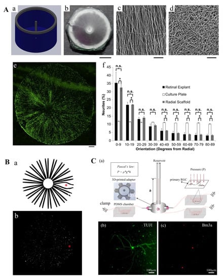 - Kador, K.E.; Grogan, S.P.; Dorthe, E.W.; Venugopalan, P.; Malek, M.F.; Goldberg, J.L.; D’Lima D, D. Control of Retinal Ganglion Cell Positioning and Neurite Growth: Combining 3D Printing with Radial Electrospun Scaffolds. Tissue Eng. Part A 2016, 22, 286–294. [Google Scholar] [CrossRef] [PubMed]