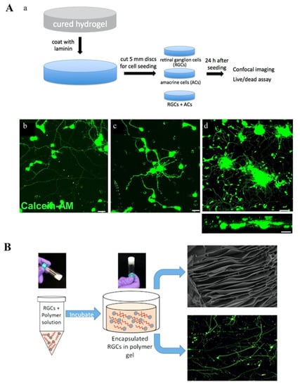 - Hertz, J.; Robinson, R.; Valenzuela, D.A.; Lavik, E.B.; Goldberg, J.L. A tunable synthetic hydrogel system for culture of retinal ganglion cells and amacrine cells. Acta Biomater. 2013, 9, 7622–7629. [Google Scholar] [CrossRef]