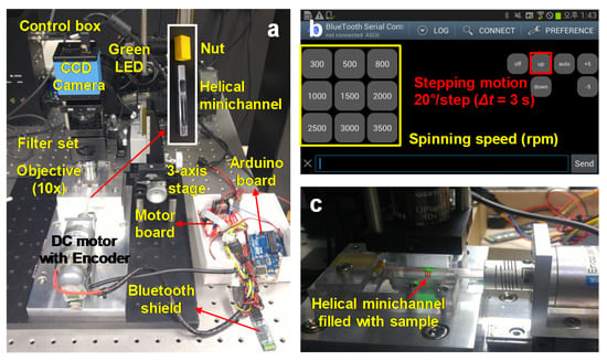 (a) Two-color-fluorescence imaging configuration with a Bluetooth-controlled DC (direct current) motor system; (b) smartphone application for motor control with an Arduino board; (c) helical minichannel filled with blood sample during acquisition of fluorescent cell images for counting.